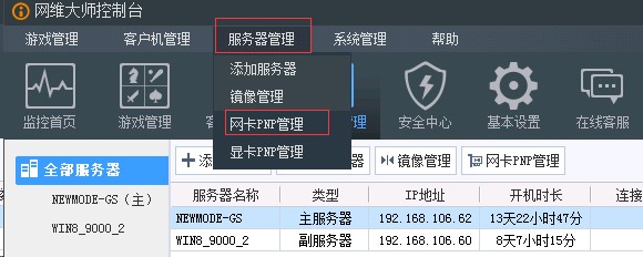 1. 点击控制台顶部菜单“服务器管理”—“网卡PNP管理”,如下图所示: