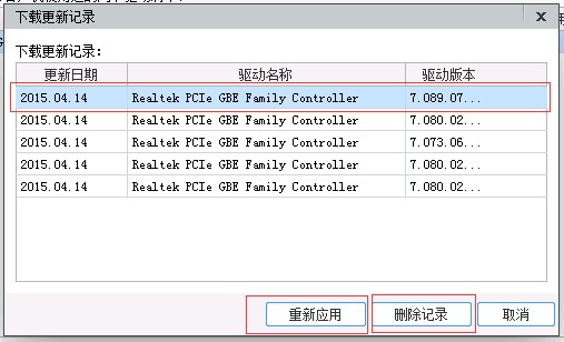 2. 在“下载更新记录”选择需要操作 的更新记录,点击按钮来重新应用或删除记录,如下图所示:
